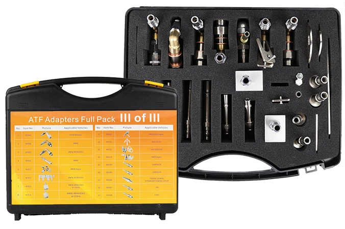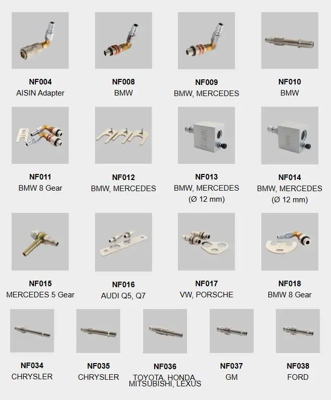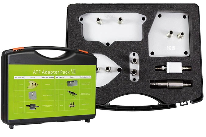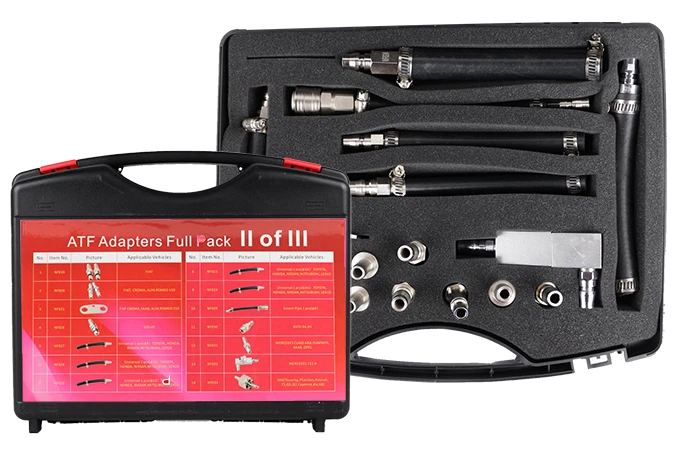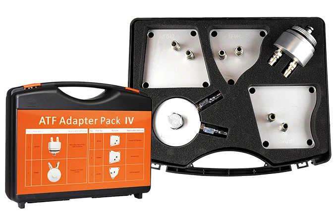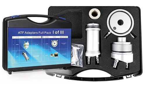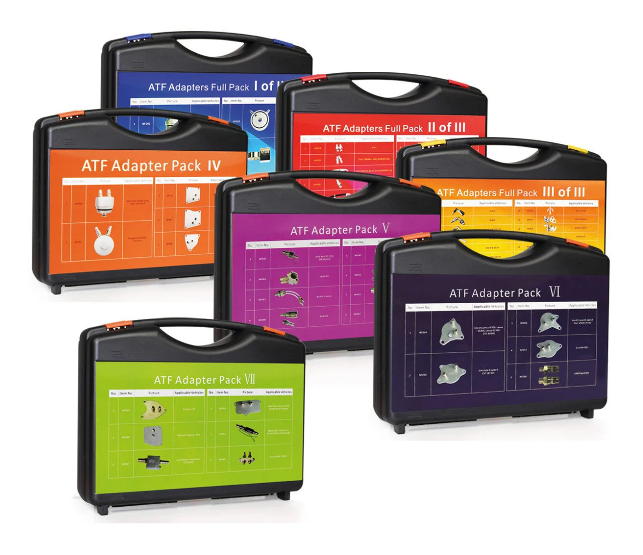 Teslimat kapsamına dahil olan standart adaptör kutusuna ek olarak, isteğe bağlı başka ATF adaptörleri de mevcuttur. ATF adaptör paketlerimiz I – VII, farklı şanzıman tiplerine ve modellerine profesyonel bağlantı sağlamak için farklı valfler, takılabilir bağlantılar, adaptör hortumları ve özel bileşenler içermektedir.