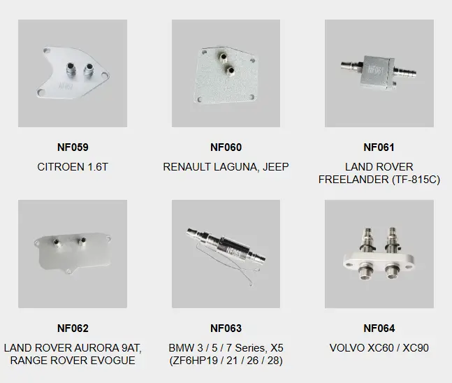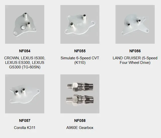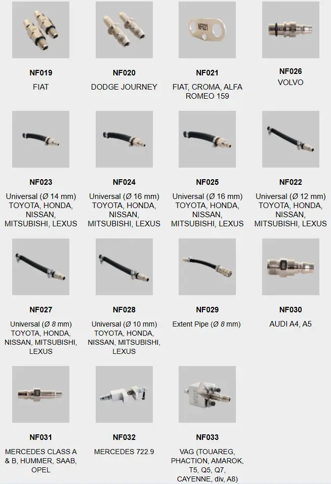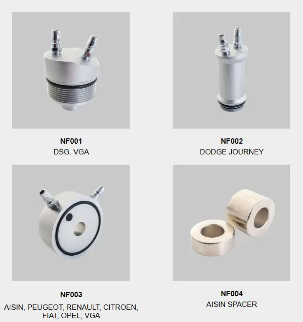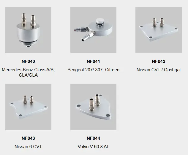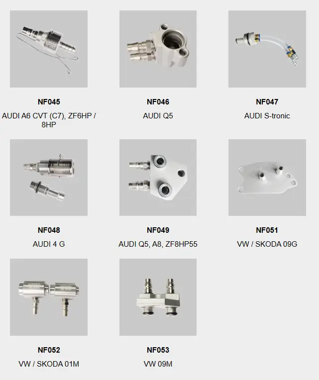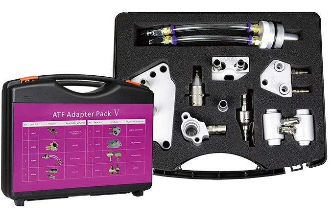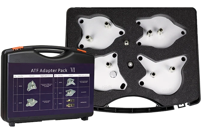 Teslimat kapsamına dahil olan standart adaptör kutusuna ek olarak, isteğe bağlı başka ATF adaptörleri de mevcuttur. ATF adaptör paketlerimiz I – VII, farklı şanzıman tiplerine ve modellerine profesyonel bağlantı sağlamak için farklı valfler, takılabilir bağlantılar, adaptör hortumları ve özel bileşenler içermektedir.
