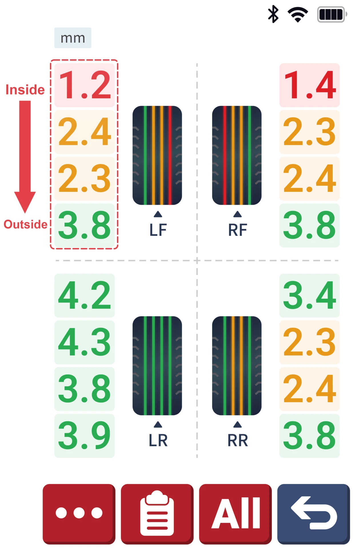 Büyük 3,97 inç dokunmatik ekran, ölçüm sonuçlarını gerçek zamanlı olarak gösterir. Bu, örneğin görünür aşınma desenleri veya düzensiz aşınma durumlarında otomatik servis önerileriyle tamamlanır.