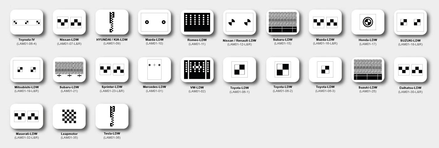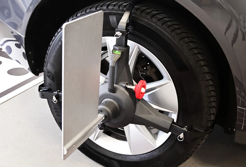 Hedef tahtası bulunan üç noktalı tekerlek kelepçesi, kalibrasyon sisteminin doğrudan ön tekerleklere sabit ve merkezlenmiş bir şekilde monte edilmesini sağlar.
