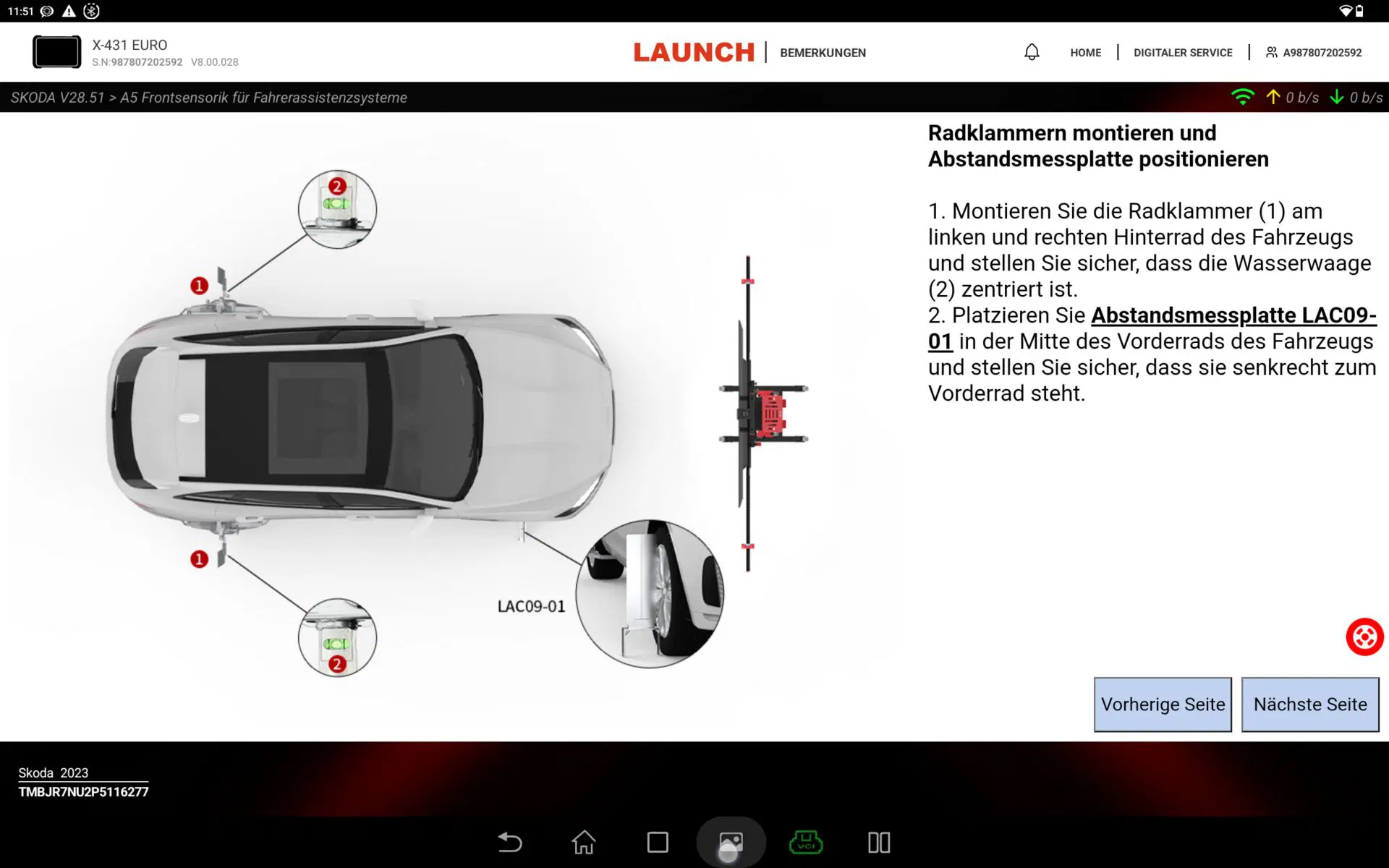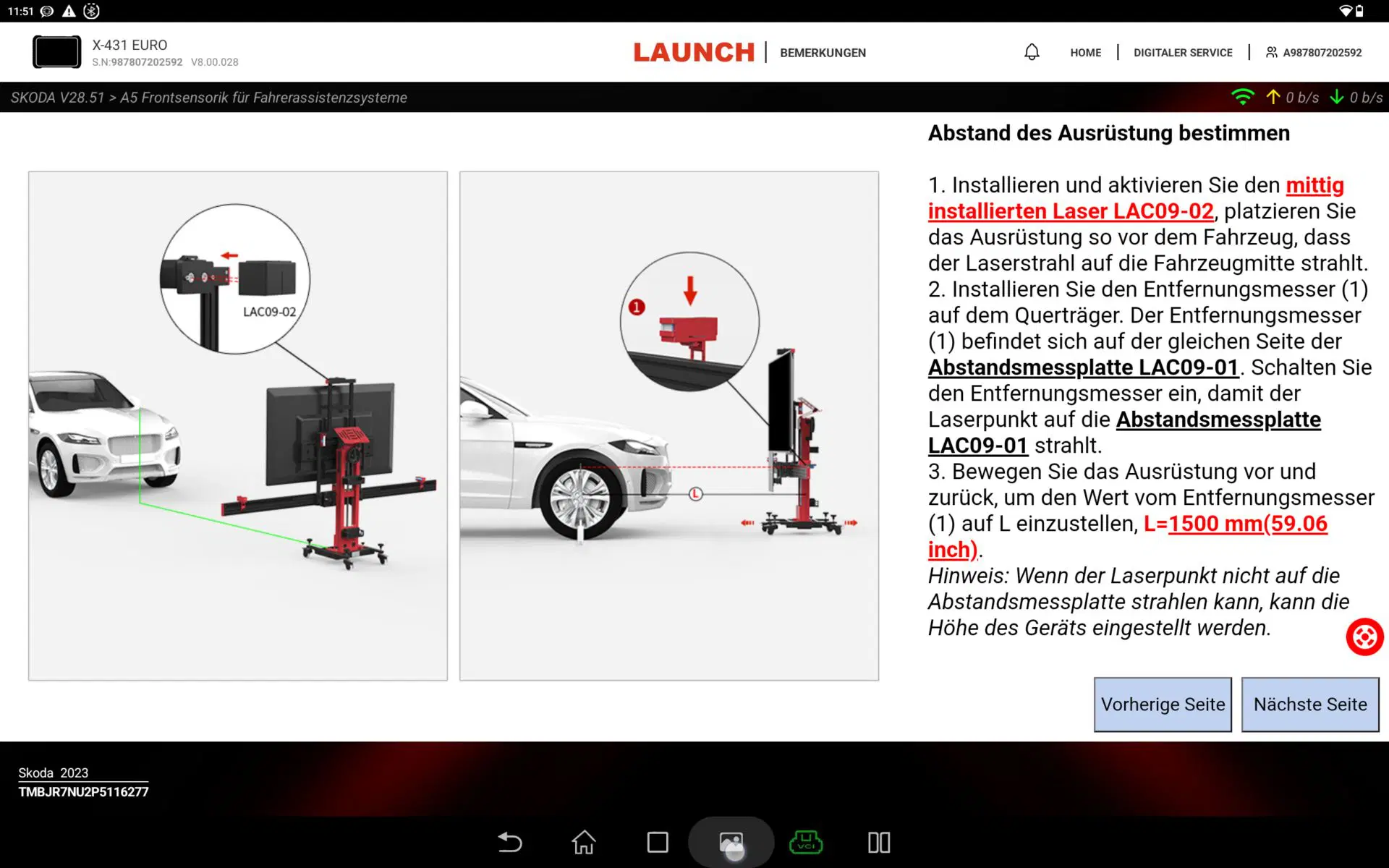 Mesafe ölçer, X-431 ADAS PRO+ V2'nin aracın önünde tam olarak merkeze konumlandırılmasına yardımcı olur. Bu, özellikle ön radar veya yeni bir ön kameranın kalibrasyonu için önemlidir.